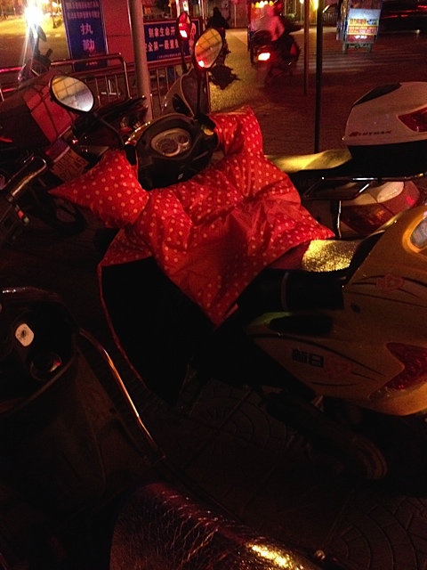 Alle Rollerfahrerinnen haben diese hübschen Deckchen, wo sie die Hände reinstecken, damit sie warm sind
