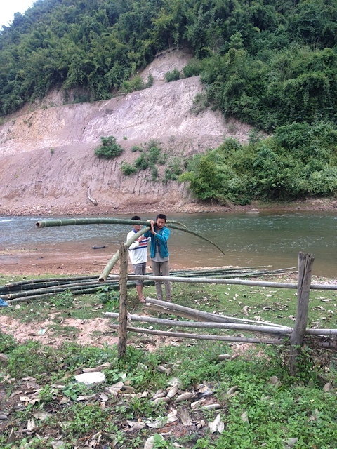 Die Bambusstangen sind heute Nacht geliefert worden und die Jungs schleppen sie an die Straße als Baumaterial