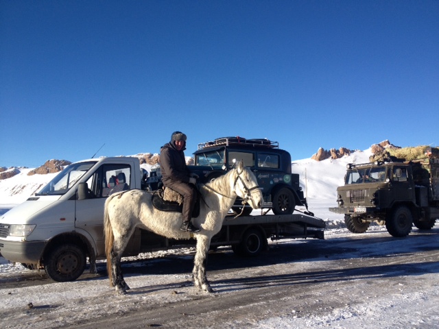 Der Behälter für die Scheibenwaschanlage ist auf schlechten Straße von Torugart nach Kashgar abgeflogen und am Motorblock geschmolzen.
