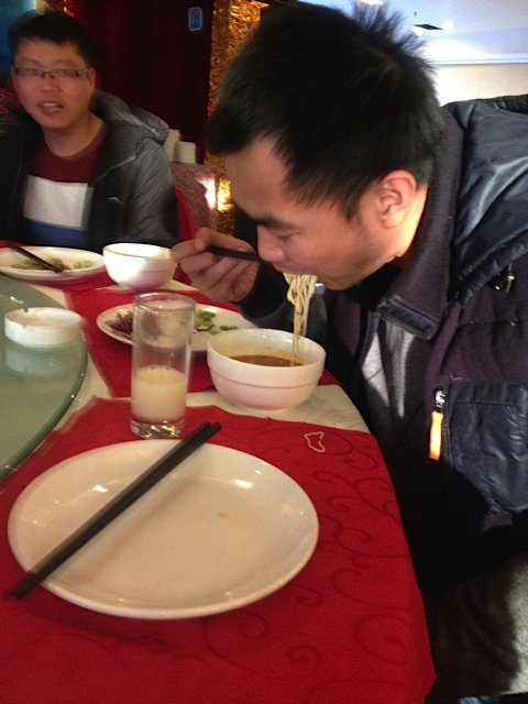 Heute gab es zum Frühstück wieder Nudeln. Ich muss noch lernen, wie man die mit den Stäbchen reinschlürft.