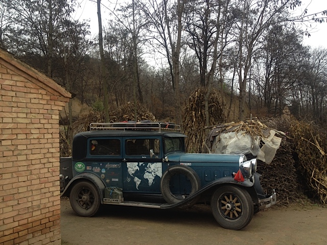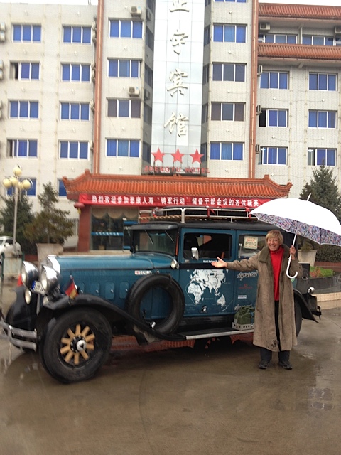 Hudo hat einen neuen Gummipuffer an der Vorderachse rechts vom Toyota bekommen.Wir fahren immer an der alten Chinesischen Mauer entlang. Die ist 24.000 km lang.Tempel in ZhangyeBewunderung, wo immer man anhältMr. Wang muß immer lügen, wie alt ich bin, fast 70, weil man dann keinen Führerschein mehr bekommt.Das ist eine Wassertankstelle.Hudos Nachtquartier. Wir nächtigen für 24,– Euro, super sauber, aber ohne Frühstück.Jede Touristenstadt hat das Wahrzeichen mit dem fliegenden Pferd. Der eine Fuß steht auf einem Vogel. Die Beine laufen nicht überkreuz, sondern beide Beine rechts oder links gleichzeitig.Heute hatte Hudo einen schweren Tag. Letze Nacht waren –7 Grad und in den Bergen hat es geschneit.Wir mußten 4 X anhalten und Hudo etwas zu trinken geben. Kaum zu sehen, aber es ging stetig bergauf.Hudo wurde immer langsamer und ich hatte den ganzen Weg Bauchschmerzen deswegen.Hier ist das Land ganz karg. Es gibt wirklich gar nichts. Kein Wasser, nie Regen. Die Chinesen haben ordentlich in Reihen Bäume angepflanzt .Auf dem Nachhauseweg habe ich mir einen Mundschutz gekauft, nur so zum Spaß und man möchte ja auch IN sein.